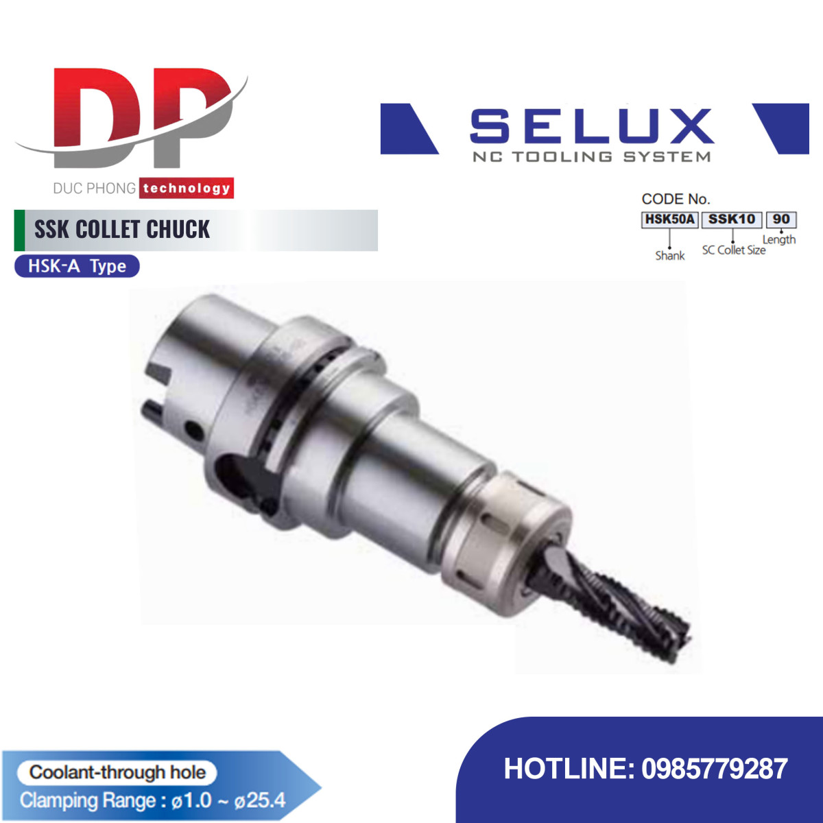 Bầu kẹp collet SSK chuôi HSK-A Series HSK Shank - Selux (SSK COLLET CHUCK) HSK-A TYPE là một loại đầu kẹp sử dụng collet SC/SK/SSK với chuôi HSK-A Shank . Sản phẩm được thiết kế để cung cấp lực kẹp mạnh mẽ và độ chính xác cao cho nhiều hoạt động gia công khác nhau.