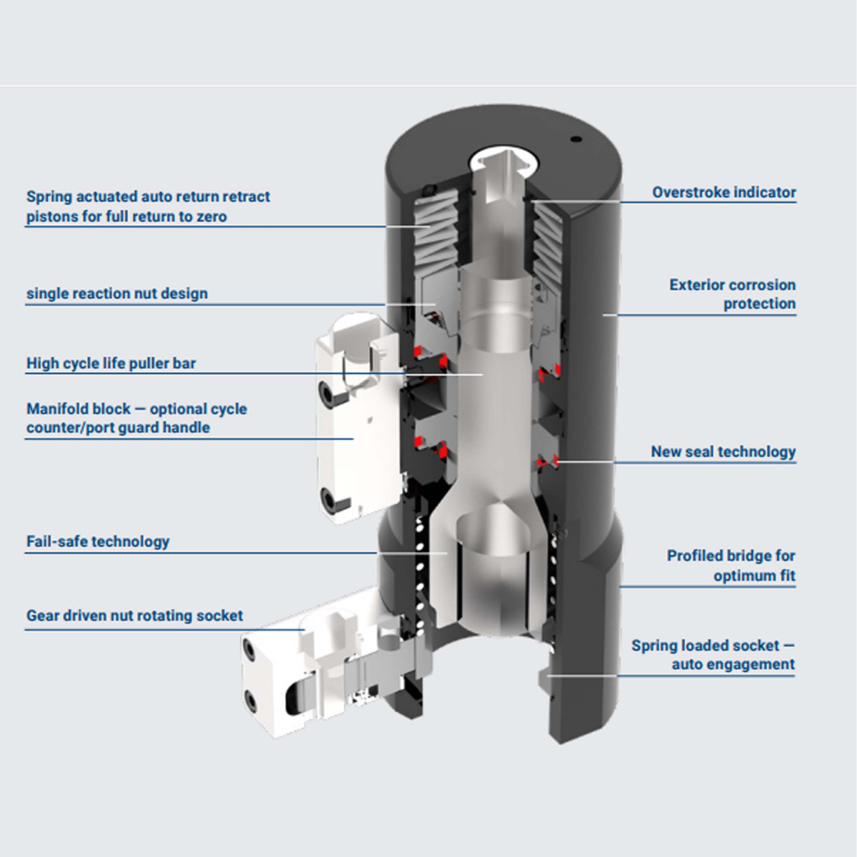 Cơ cấu chống quá hành trình (over-stroke prevention) loại bỏ nguy cơ piston vượt quá giới hạn làm việc. Trang bị chỉ báo quá hành trình (over-stroke indicator) và hệ thống an toàn bên trong (internal fail-safe) giúp bộ căng vẫn cố định trên bu lông trong trường hợp thanh kéo (puller bar) bị hỏng.