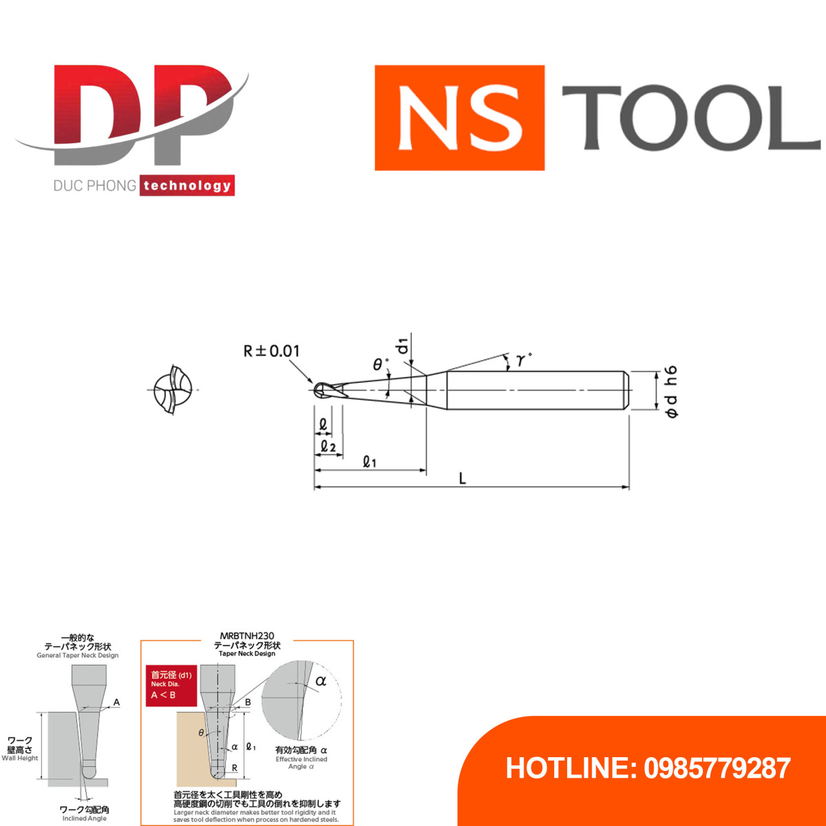 Dao phay cầu cổ taper MRBTNH230 thuộc dòng MUGEN COATING PREMIUM của NS TOOL, được thiết kế để gia công sâu với độ chính xác cao trên thép đã qua tôi. Thiết kế cổ taper tối ưu cùng lớp phủ MUGEN COATING PREMIUM giúp tăng độ cứng vững, giảm rung động và nâng cao khả năng chống mài mòn khi gia công vật liệu cứng. Dòng dao 2 me cắt này có tổng cộng 236 kích thước khác nhau, đáp ứng nhu cầu gia công đa dạng từ chi tiết nhỏ đến khuôn mẫu phức tạp.