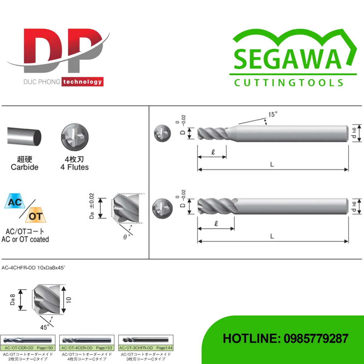Dao phay ngón AC-4CHFR-OD và OT-4CHFR-OD Carbide 4 me - Segawa là sản phẩm dành cho Hiệu suất cao. Dao có 4 me cắt và có tính năng cắt góc (Chamfer) ở đầu dao. Đây là phiên bản Tùy chỉnh, cho phép chọn góc và kích thước cắt góc (Corner-C) theo yêu cầu.
