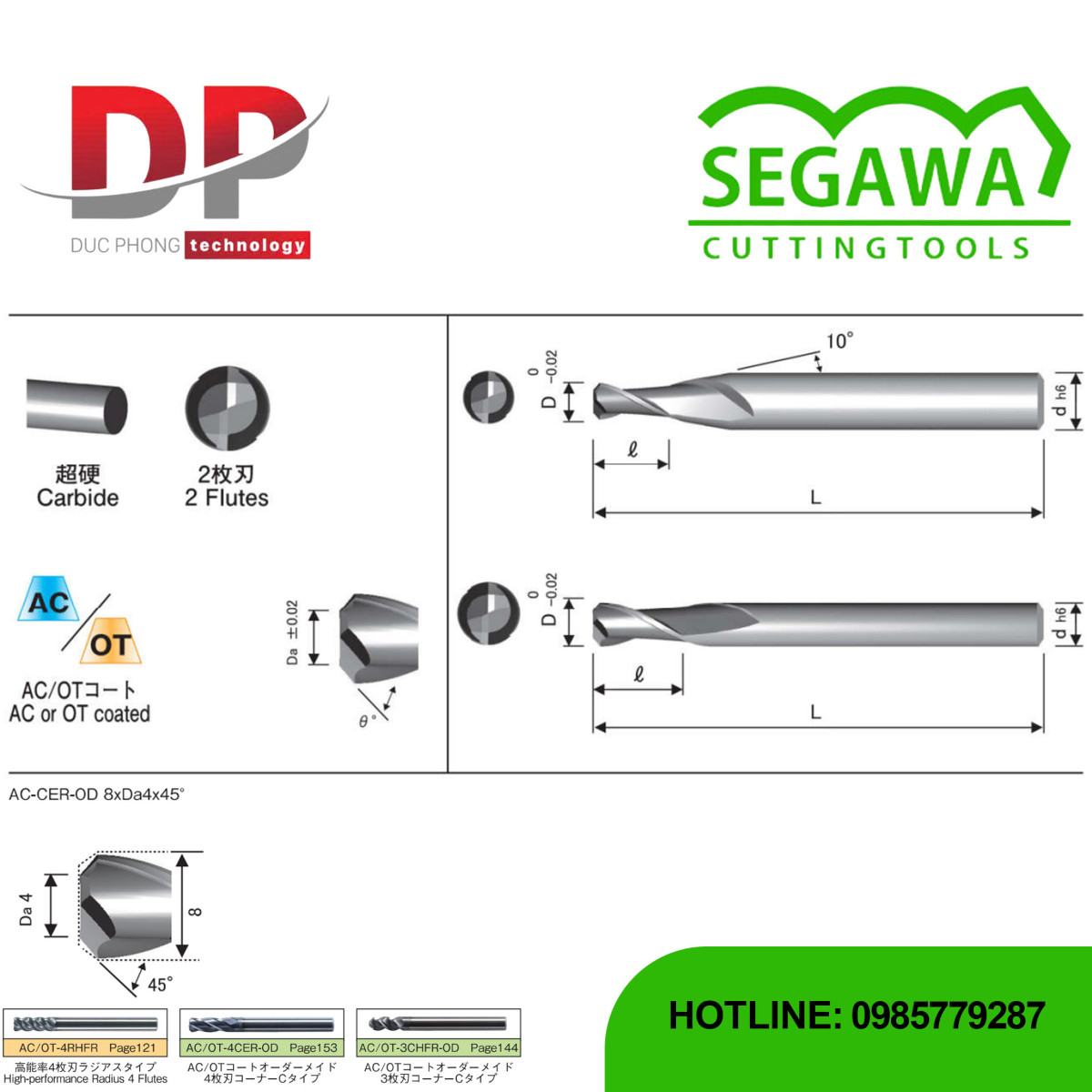 Dao phay ngón AC-CER-OD và OT-CER-OD Carbide 2 me - Segawa là loại dao cắt góc được chế tạo từ vật liệu Carbide. Dao có 2 me cắt và có tính năng cắt góc ở đầu dao. Đây là phiên bản Tùy chỉnh, cho phép người dùng chọn kích thước góc cắt (Corner-C) theo yêu cầu.