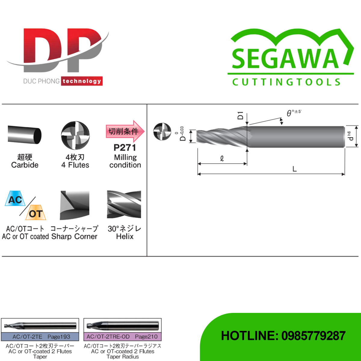 Dao phay ngón côn AC-4TE và OT-4TE Carbide 4 me - Segawa là một sản phẩm mới, là loại dao phay ngón côn. Dao được chế tạo từ Carbide, có 4 me cắt và có lớp phủ AC hoặc OT.