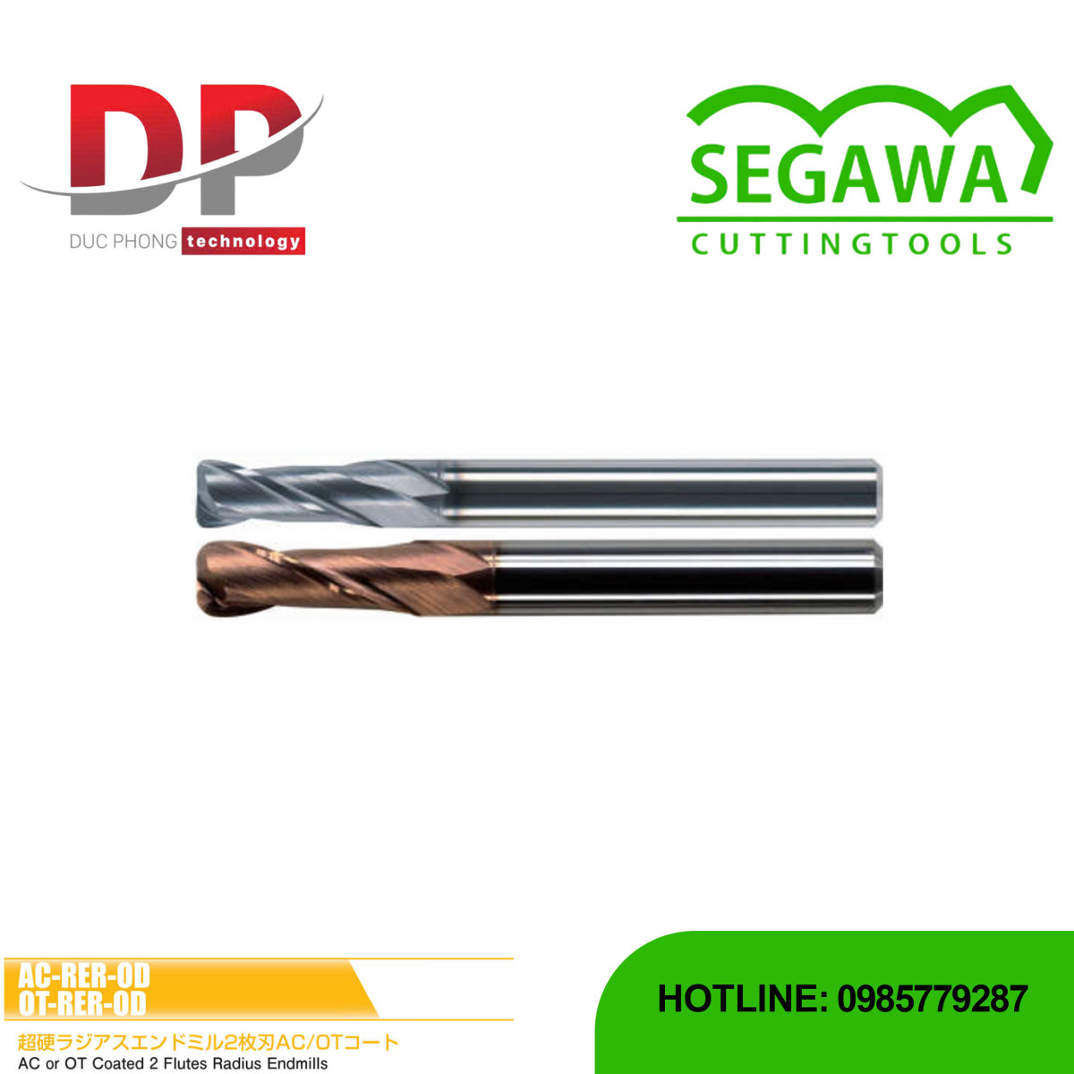 Dao phay ngón Radius AC-RER-OD và OT-RER-OD Carbide 2 me - Segawa có phủ AC/OT đây là loại dao Radius (có góc bo) với 2 me cắt và hai tùy chọn lớp phủ hiệu suất cao AC hoặc OT. Mục đích chính của phiên bản này là cho phép người dùng chọn kích thước tùy chỉnh ở góc bo.