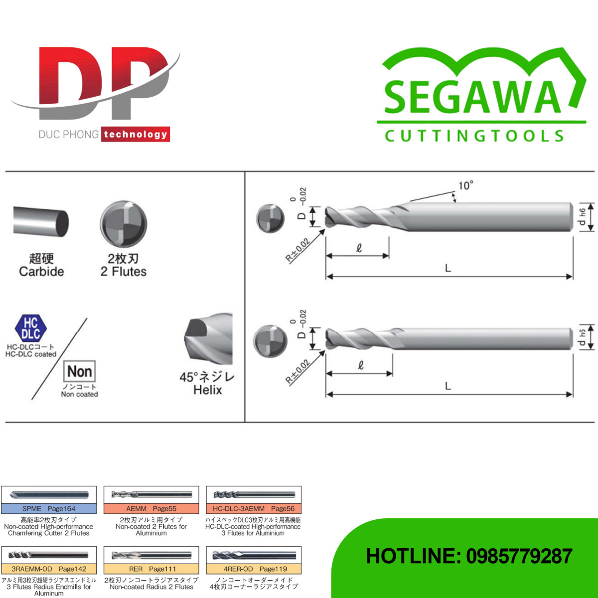 Dao phay ngón Radius HC-DLC-RAEMM-OD và RAEMM-OD Carbide 2 me - Segawa là loại dao chuyên dùng cho nhôm. Dao có 2 me cắt và góc bo Radius (). Đây là phiên bản tùy chỉnh, cho phép cài đặt Radius (góc bo ) bổ sung theo nhu cầu.