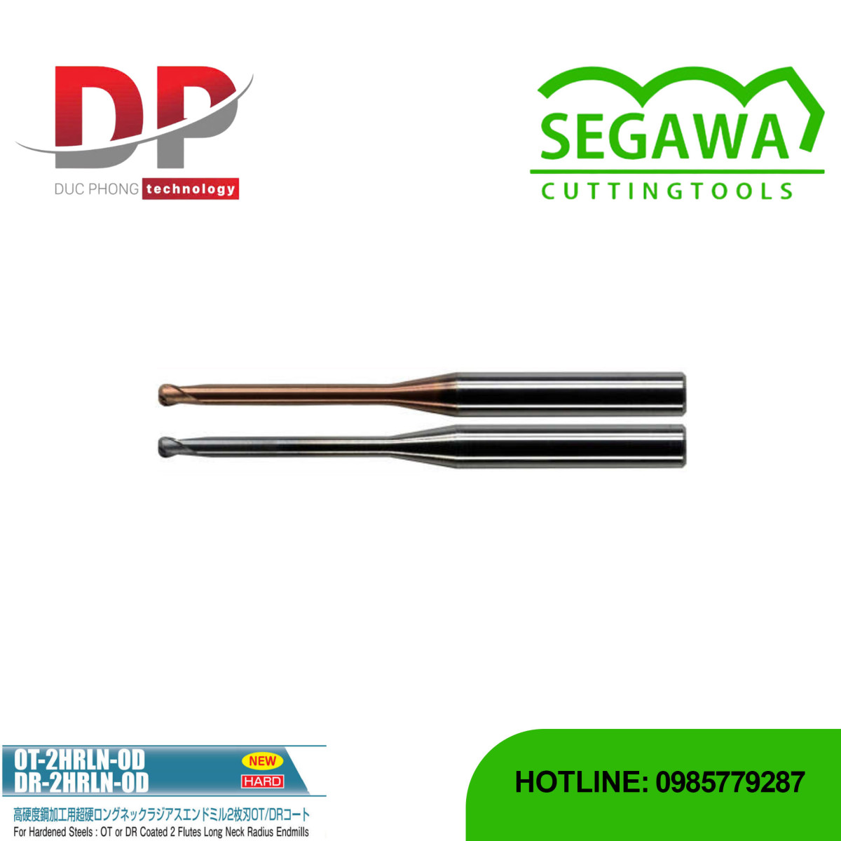 Dao phay ngón Radius OT-2HRLN-OD và DR-2HRLN-OD Carbide 2 me - Segawa là sản phẩm mới HARD, chuyên dùng cho gia công thép có độ cứng cao. Đây là loại dao cổ dài với 2 me cắt và có góc bo Radius (). Là phiên bản Tùy chỉnh, cho phép chọn kích thước tùy chỉnh ở góc bo.