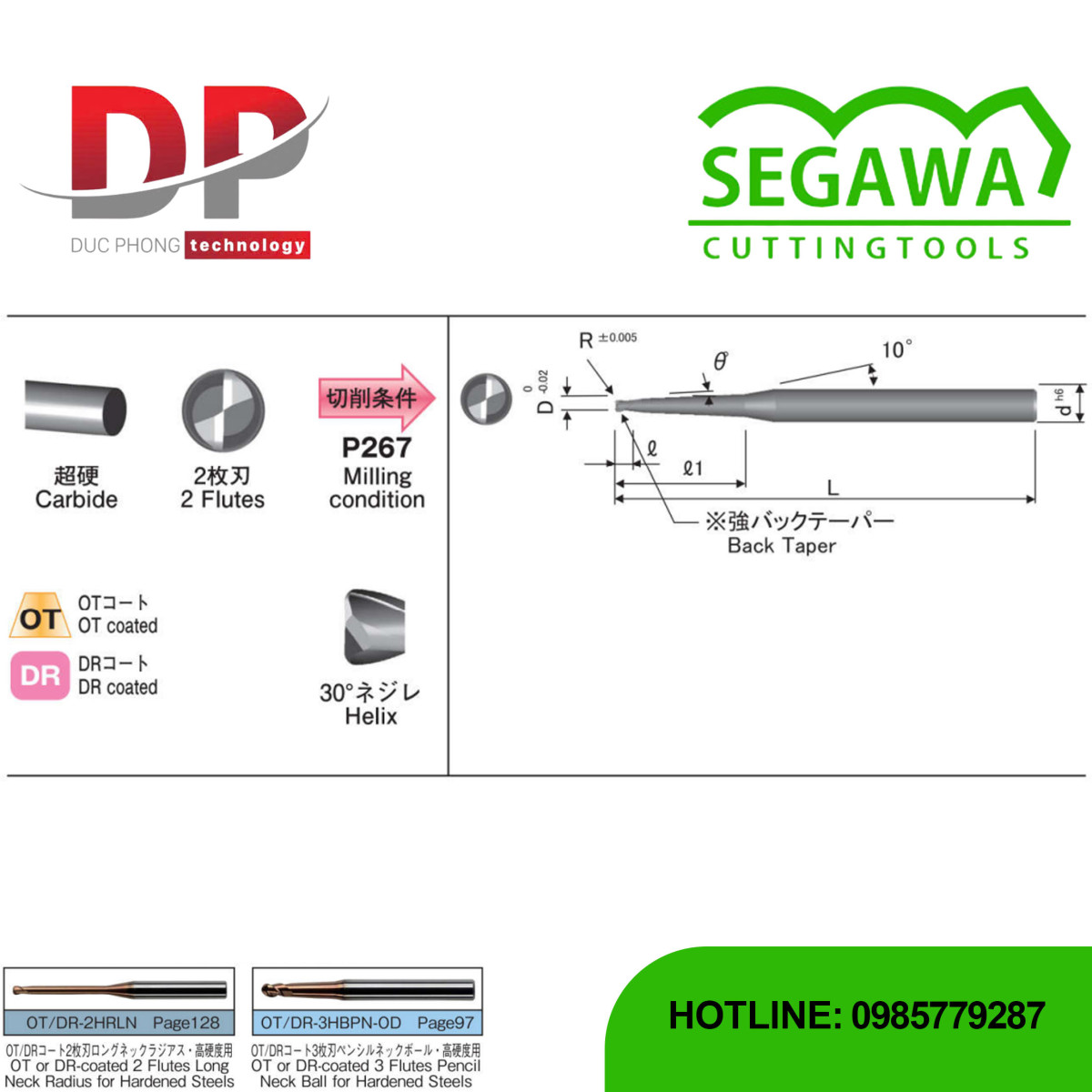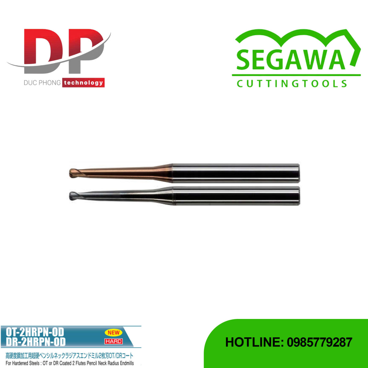 Dao phay ngón Radius OT-2HRPN-OD và DR-2HRPN-OD Carbide 2 me - Segawa là sản phẩm mới chuyên dùng cho Gia công thép có độ cứng cao. Đây là loại dao cổ bút chì có 2 me cắt và góc bo Radius (). Thiết kế cổ bút chì (đường kính cổ nhỏ hơn đường kính cắt) giúp tránh va chạm thành phôi khi gia công sâu. Đây là phiên bản tùy chỉnh, cho phép chọn kích thước tùy chỉnh ở góc bo.