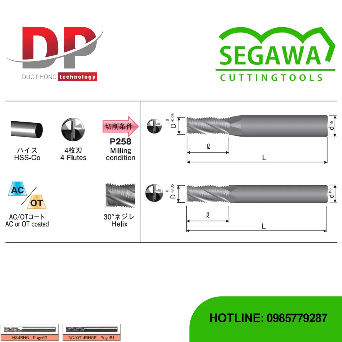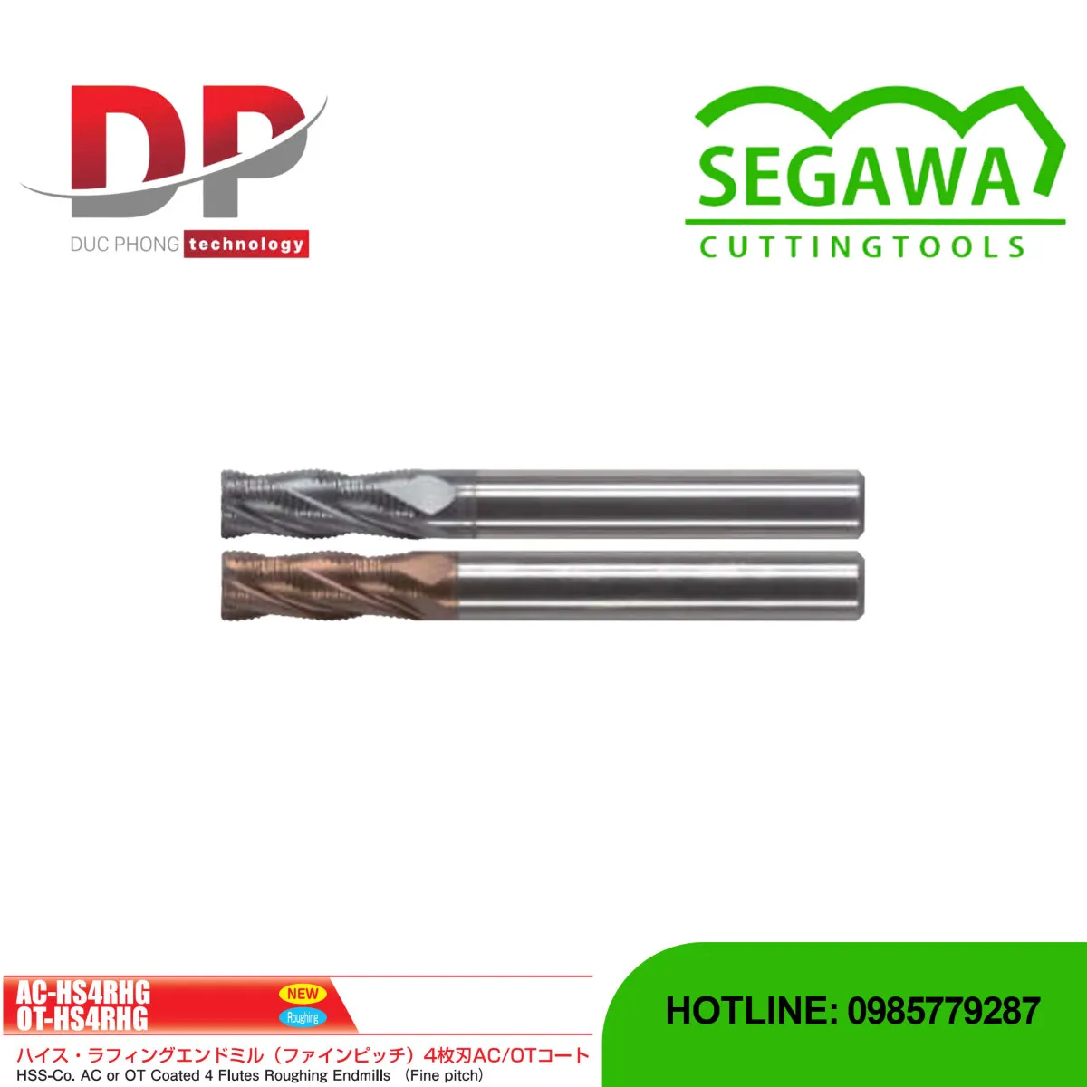 Dao phay ngón thô HS4RHG HSS-Co 4 me có phủ AC hoặc OT - Segawa (AC-HS4RHG và OT-HS4RHG) là dòng dao phay ngón thô chế tạo từ HSS-Co. Dao có thiết kế 4 me cắt với bước răng mịn và góc xoắn 30, ngoài ra được thiết kế cho các ứng dụng phay thô đến phay bán tinh.