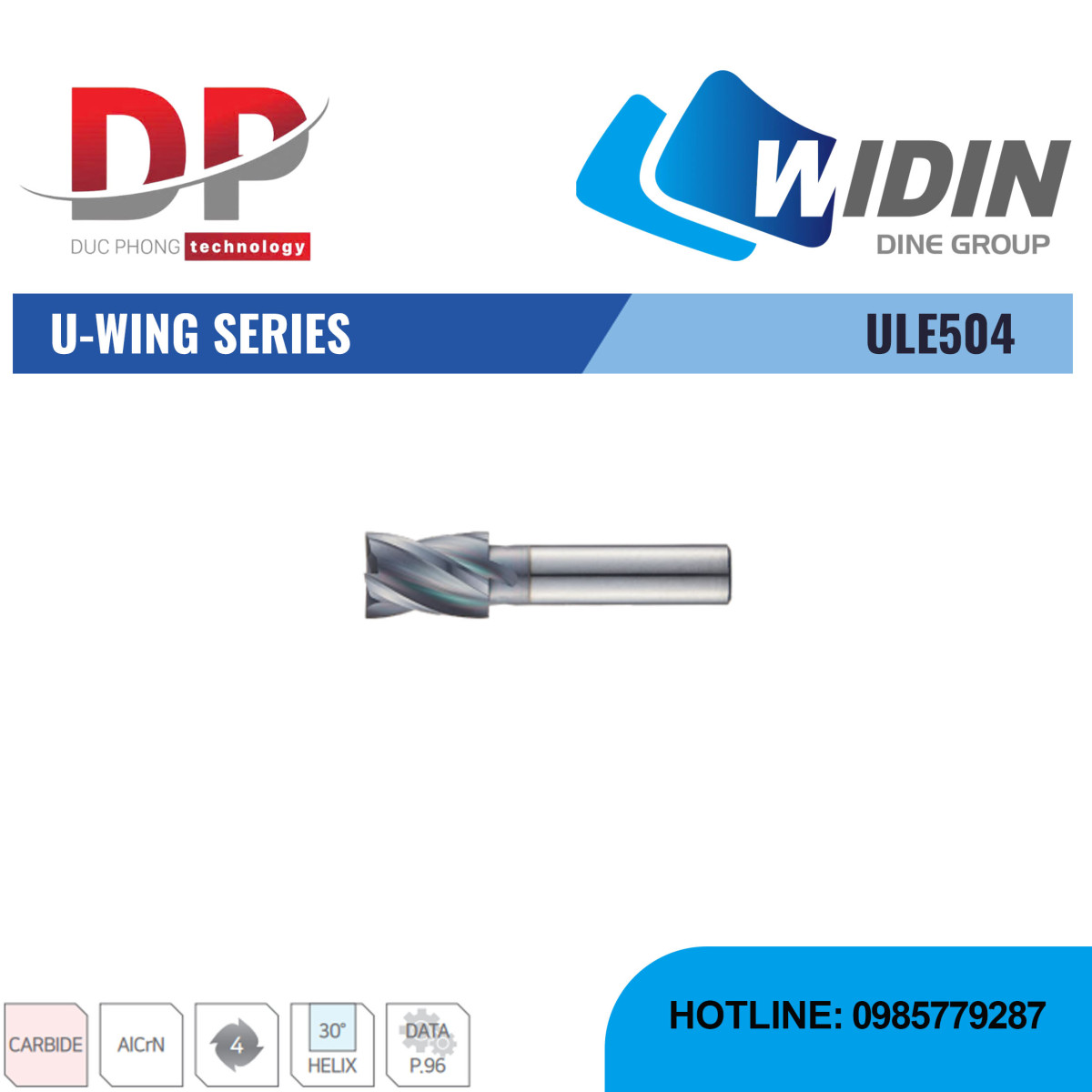 Dao phay ngón U-WING Series ULE504 - WIDIN là loại dao phay ngón vuông, được thiết kế chyên dụng gia công thép có độ cứng trung bình và thép khuôn với độ cứng từ 30-50 HRc.