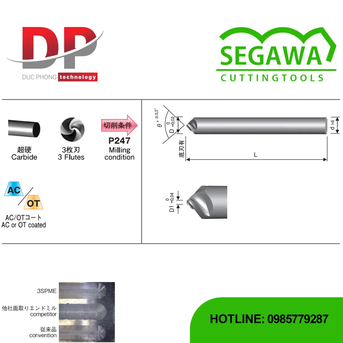 Dao phay vát mép AC-3SPME và OT-3SPME Carbide 3 me - Segawa là dòng dao phay vát mép hiệu suất cao, chế tạo từ Carbide, với thiết kế xoắn và 3 me cắt, có lớp phủ AC/OT giúp cải thiện tuổi thọ và chất lượng gia công.