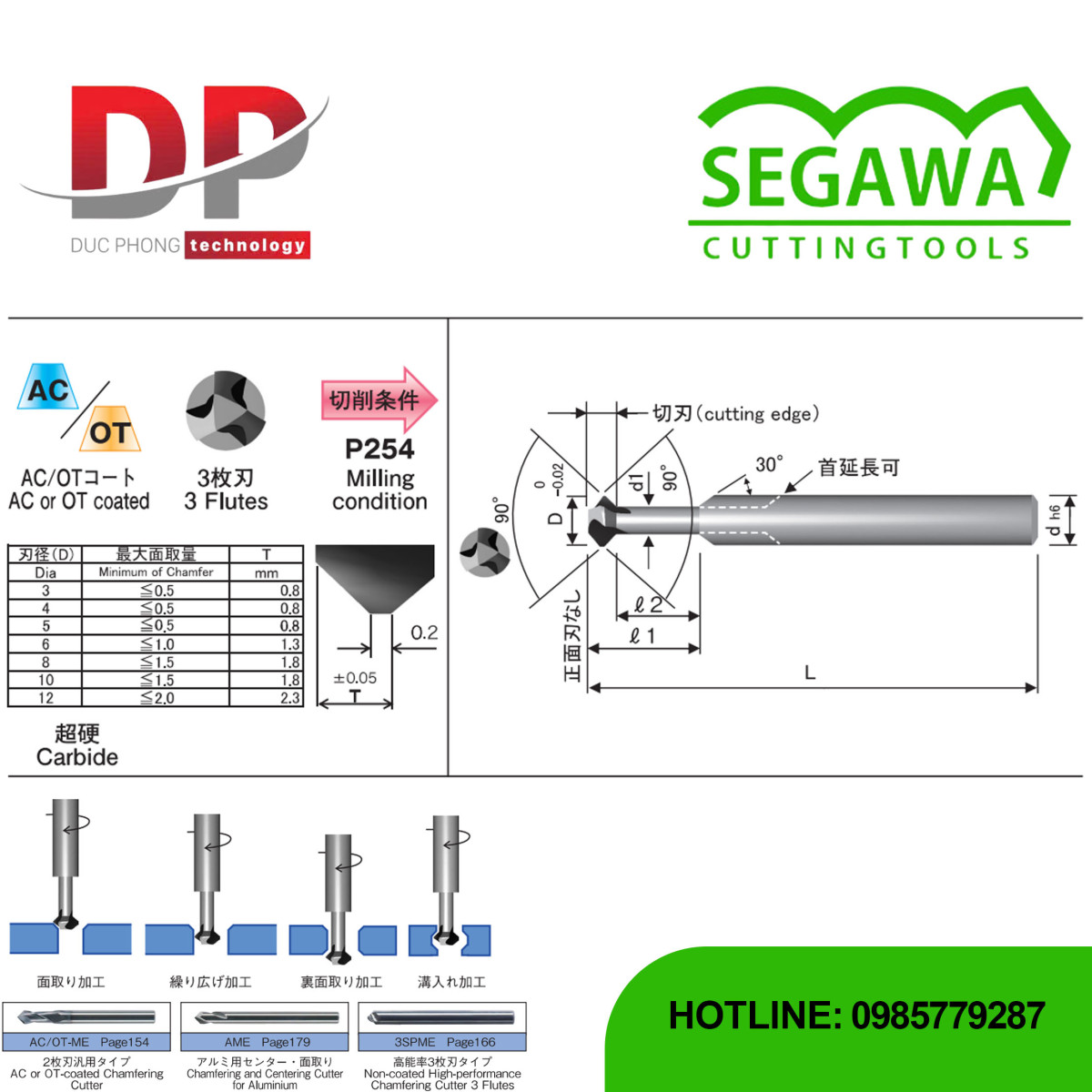 Dao phay vát mép bo cạnh ngược AC-CC và OT-CC Carbide 3 me - Segawa là dòng dao cụ hiệu suất cao, được chế tạo từ Carbide. Dao có 3 lưỡi cắt, được tăng cường lớp phủ AC hoặc OT tiên tiến. Thiết kế đặc biệt với cổ dao thon gọn cho phép thực hiện nhiều chức năng, tập trung vào các thao tác gia công ngược và bo cạnh.