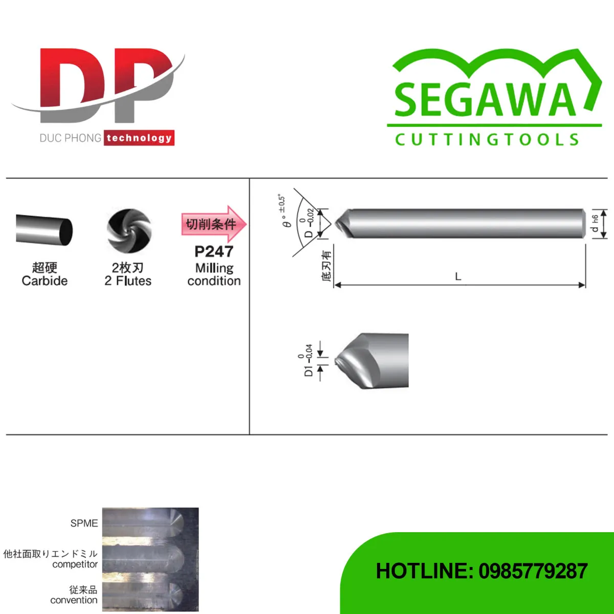 Dao phay vát mép SPME Carbide 2 me - Segawa là dao phay vát mép hiệu suất cao được chế tạo từ vật liệu Carbide, có thiết kế xoắn trên lưỡi cắt và không có lớp phủ.