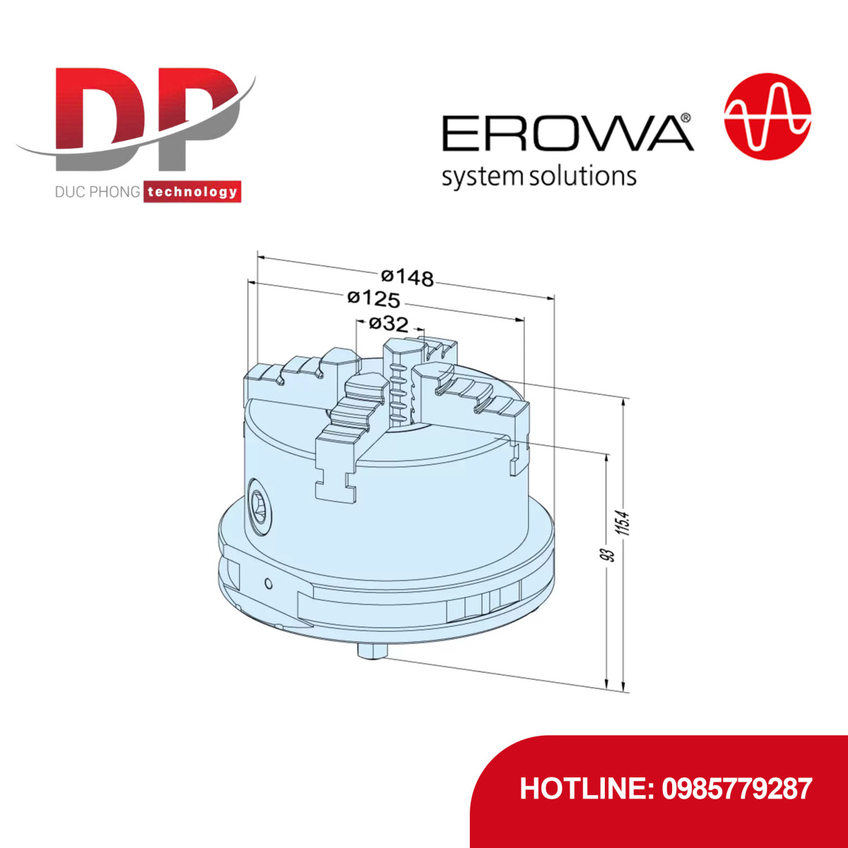 Thiết kế đồng tâm: Là Đầu kẹp 4 chấu vận hành thủ công (Manual 4-jaw concentric chuck), đường kính Ø 125 mm, lắp cố định trên Pallet Ø 148 G.