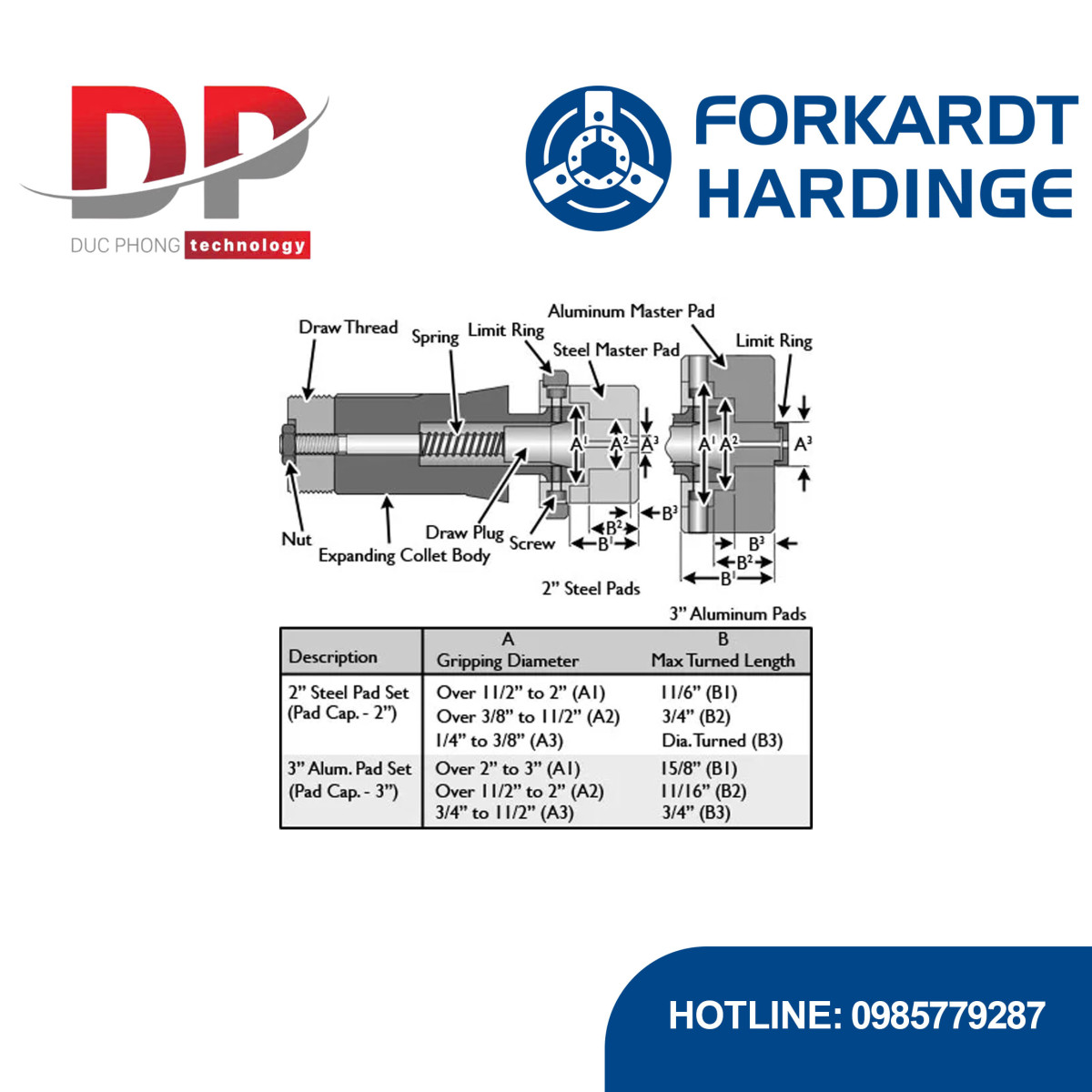Đệm kẹp 3” Aluminum Master Pad Set (mã 5EC-70-7) là bộ pad nhôm cao cấp được thiết kế dành cho collet mở rộng dòng 5C của Forkardthardinge. Sản phẩm này dùng để gia công các chi tiết yêu cầu độ chính xác cao, đồng thời giúp cố định và mở rộng collet một cách ổn định khi kẹp phôi.