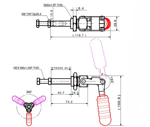 Điều chỉnh linh hoạt: Thanh đẩy có thể điều chỉnh được vị trí (có ren), cho phép người dùng tinh chỉnh hành trình và lực kẹp để phù hợp với các độ dày và hình dạng vật liệu khác nhau.