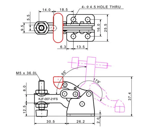 Thiết kế ngang (Horizontal Hold-Down Type): Tay cầm của kẹp sẽ nằm ngang (song song với mặt phẳng lắp đặt) khi ở trạng thái khóa. Kiểu thiết kế này đặc biệt hữu ích trong các không gian làm việc có giới hạn về chiều cao hoặc khi cần thao tác từ phía bên.
