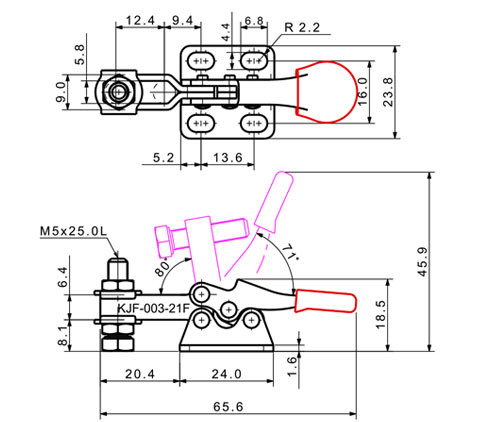 Kẹp gạt loại ngang KJF-003-21F (Lực kẹp 30 kgf), một sản phẩm tiện lợi từ thương hiệu KJF (Hàn Quốc). Đây là một loại kẹp nhanh (toggle clamp), cụ thể là kẹp loại ngang, với thiết kế đế mặt bích và được trang bị tay đòn kẹp dạng chữ U có khả năng điều chỉnh. Kẹp này lý tưởng cho các ứng dụng cần lực kẹp nhỏ đến trung bình, khả năng cố định nhanh chóng và linh hoạt, đặc biệt là khi tay cầm nằm ngang giúp tiết kiệm không gian và dễ thao tác.
