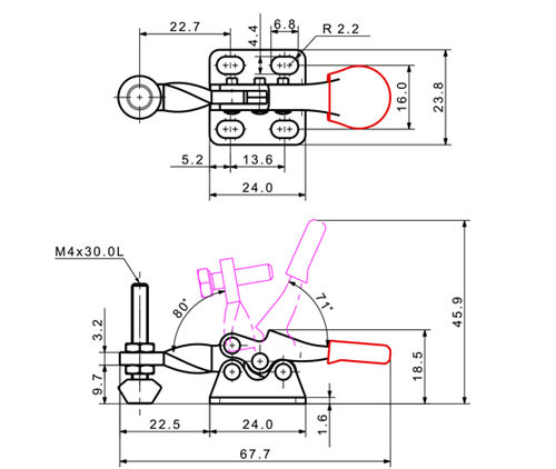 Kẹp gạt loại ngang KJF-003-25F (Lực kẹp 30 kgf), một sản phẩm thuộc dòng kẹp nhanh (toggle clamp) chất lượng cao từ thương hiệu KJF (Hàn Quốc). Đây là một loại kẹp ngang, với thiết kế đế mặt bích chắc chắn và được trang bị tay đòn kẹp dạng chữ U có khả năng điều chỉnh vị trí. Với lực kẹp 30kgf và hành trình điều chỉnh lớn hơn so với KJF-003-21F, kẹp này là lựa chọn lý tưởng cho các ứng dụng cần lực kẹp vừa phải, khả năng cố định linh hoạt các chi tiết có kích thước khác nhau, đồng thời giữ tay cầm nằm ngang để tối ưu không gian làm việc.