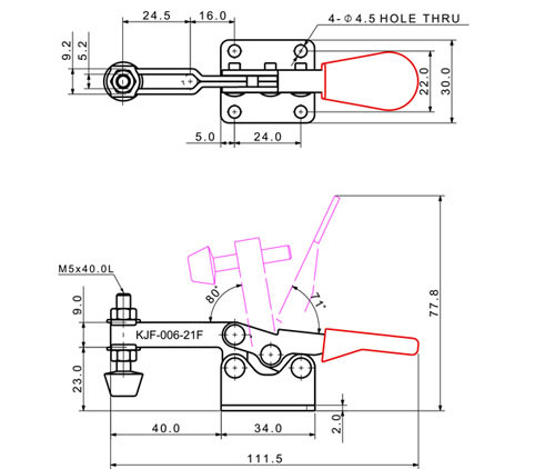 Kẹp gạt loại ngang KJF-006-21F (Lực kẹp 60 kgf), một sản phẩm thuộc dòng kẹp nhanh (toggle clamp) chất lượng từ thương hiệu KJF (Hàn Quốc). Đây là một loại kẹp ngang, với thiết kế đế mặt bích chắc chắn và được trang bị tay đòn kẹp dạng chữ U có khả năng điều chỉnh vị trí. Với lực kẹp 60kgf, kẹp này là lựa chọn lý tưởng cho các ứng dụng cần lực kẹp trung bình, khả năng cố định linh hoạt các chi tiết, đồng thời giữ tay cầm nằm ngang để tối ưu không gian làm việc.