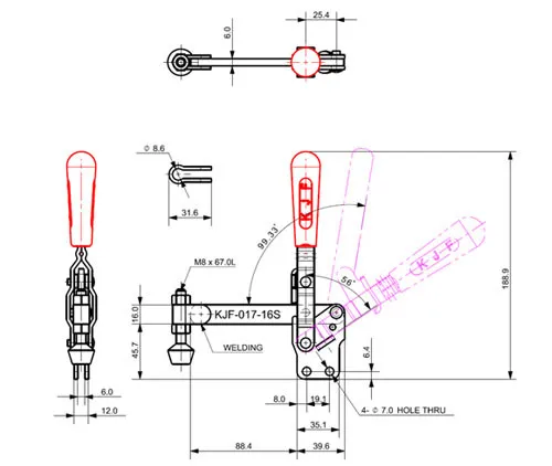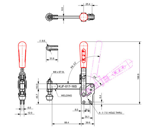 Loại đế: KJF-017-16S có chân đế thẳng (Straight Base), giúp việc lắp đặt kẹp dễ dàng và chắc chắn trên các bề mặt phẳng hoặc thành của đồ gá, đảm bảo sự ổn định và đáng tin cậy khi kẹp chịu tải.