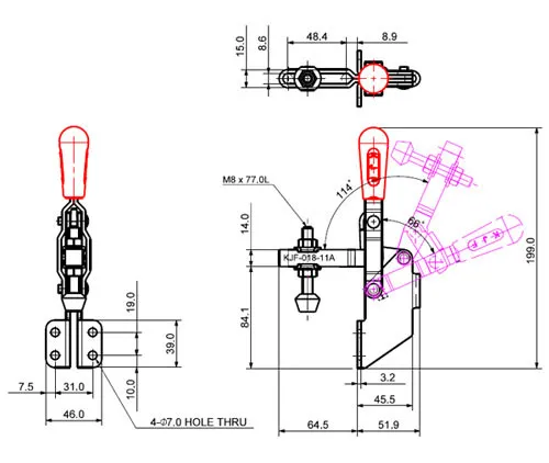 Kẹp gạt kiểu thẳng đứng đế góc KJF-018-11A (Lực kẹp 180 kg), một sản phẩm chuyên dụng từ thương hiệu KJF (Hàn Quốc). Đây là một loại kẹp nhanh (toggle clamp), cụ thể là kẹp kiểu thẳng đứng (vertical type), kết hợp với thiết kế đế vuông góc (angle base). Kẹp này lý tưởng để cố định chi tiết một cách vững chắc trong các ứng dụng công nghiệp, đặc biệt khi không gian lắp đặt bị hạn chế hoặc cần kẹp từ một góc.