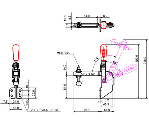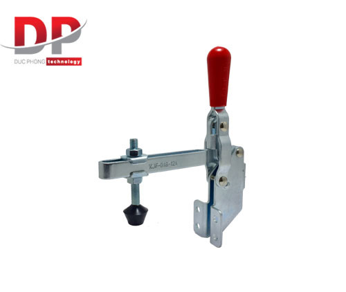 Kẹp gạt kiểu thẳng đứng đế góc KJF-018-12A (Lực kẹp 180 kg), một sản phẩm chuyên dụng từ thương hiệu KJF (Hàn Quốc). Đây là một loại kẹp nhanh (toggle clamp), cụ thể là kẹp kiểu thẳng đứng (vertical type), kết hợp với thiết kế đế vuông góc (angle base) và được trang bị hành trình kẹp dài. Sự kết hợp này mang lại khả năng cố định chi tiết hiệu quả, linh hoạt trong việc lắp đặt ở vị trí góc, và phù hợp với các vật liệu có độ dày khác nhau.