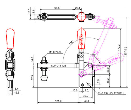 Kẹp gạt loại thẳng KJF-018-12S (Lực kẹp 180 kg), một sản phẩm cao cấp của thương hiệu KJF (Hàn Quốc). Đây là một loại kẹp nhanh (toggle clamp), cụ thể là kẹp gạt loại thẳng (straight line action clamp), được thiết kế đặc biệt để cung cấp lực kẹp mạnh mẽ và hoạt động bền bỉ trong các môi trường đòi hỏi khả năng chống ăn mòn cao, đồng thời cần hành trình kẹp dài.