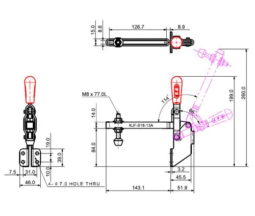 Kẹp gạt kiểu thẳng đứng đế góc KJF-018-13A (Lực kẹp 180 kg), một sản phẩm chuyên dụng từ thương hiệu KJF (Hàn Quốc). Đây là một loại kẹp nhanh (toggle clamp), cụ thể là kẹp kiểu thẳng đứng (vertical type), kết hợp với thiết kế đế vuông góc (angle base) và được trang bị thanh kẹp chữ U có thể điều chỉnh. Sự kết hợp này mang lại khả năng cố định chi tiết hiệu quả, linh hoạt trong việc điều chỉnh điểm kẹp, và phù hợp với các vị trí lắp đặt khó khăn.