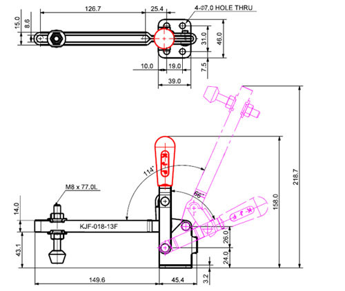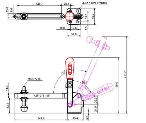 Hành trình thanh kẹp cực dài: Mã "13F" trong dòng KJF-018 thường chỉ ra phiên bản có hành trình thanh kẹp (plunger stroke) dài nhất trong phân khúc này. Điều này cực kỳ hữu ích khi cần kẹp các vật liệu có độ dày rất khác nhau hoặc khi cần tiếp cận và kẹp các điểm sâu bên trong đồ gá, mang lại sự linh hoạt tối đa. Dựa trên thông tin tìm được, hành trình kẹp của KJF-018-13F là 126.7 mm hoặc 195 mm tùy thuộc vào nguồn cụ thể, nhưng chắc chắn là dài hơn các phiên bản 11F và 12F.