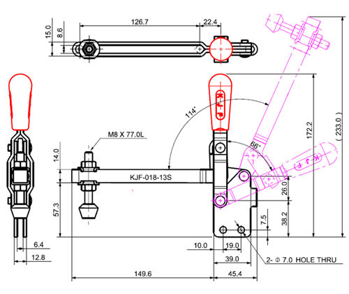 Kẹp gạt loại thẳng KJF-018-13S (Lực kẹp 180 kg), một sản phẩm cao cấp của thương hiệu KJF (Hàn Quốc). Đây là một loại kẹp nhanh (toggle clamp), cụ thể là kẹp gạt loại thẳng (straight line action clamp), được thiết kế đặc biệt để cung cấp lực kẹp mạnh mẽ và hoạt động bền bỉ trong các môi trường đòi hỏi khả năng chống ăn mòn cao, cùng với sự linh hoạt trong việc điều chỉnh điểm kẹp.
