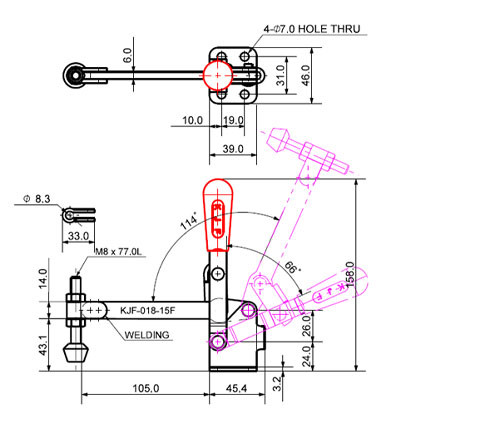 Góc mở và hành trình: Theo thông tin từ nhà sản xuất, kẹp này có góc mở tay cầm 66˚ và góc di chuyển cánh tay (plunger move) 114˚. Chiều dài điều chỉnh trục chính (hành trình) của KJF-018-15F là khoảng 48.4 mm.