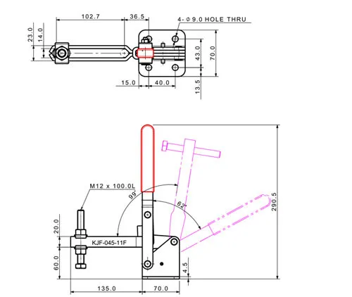Kẹp gạt loại thẳng KJF-045-11F (Lực kẹp 450 kg), một sản phẩm thuộc phân khúc kẹp tải trọng rất lớn của thương hiệu KJF (Hàn Quốc). Đây là một loại kẹp nhanh (toggle clamp), được thiết kế đặc biệt để cung cấp lực kẹp cực mạnh và thao tác đẩy/kéo theo phương thẳng cho các ứng dụng công nghiệp nặng.