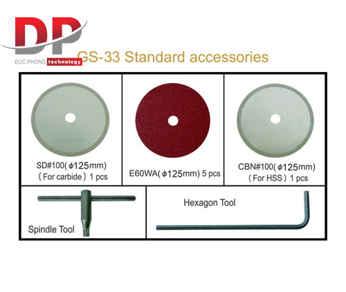 | Standard Accessories | SD#100 (Φ125mm) - For Carbide x 1 CBN#100 (Φ125mm) - For HSS x 1 E60WA (Φ5") x 5 Spindle Tool x 1 Hex Wrench 4mm x 1, 5mm x 1 Cutting Wheel Fix Wrench x 1 Filter Mesh x 1 Vacuum Pipe Adapter x 1 |
