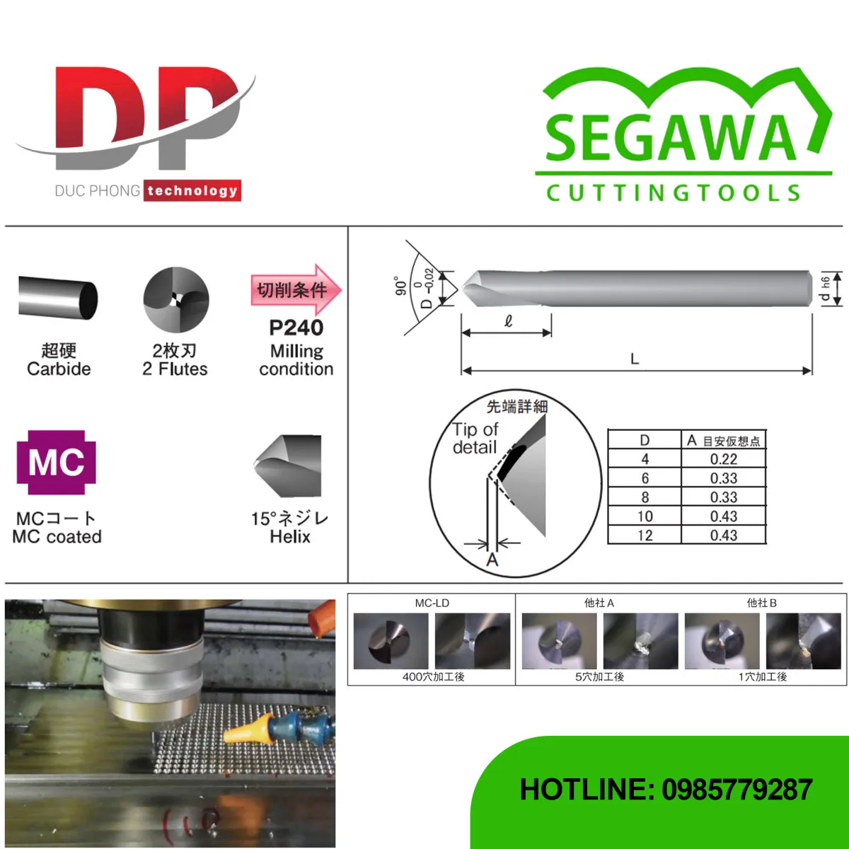 Mũi khoan Chamfer MC-LD Carbide 2 me - Segawa là dụng cụ cắt chuyên dụng được chế tạo từ vật liệu Carbide, có lớp phủ MC, dùng cho việc định tâm, vát rãnh chữ V và vát mép.