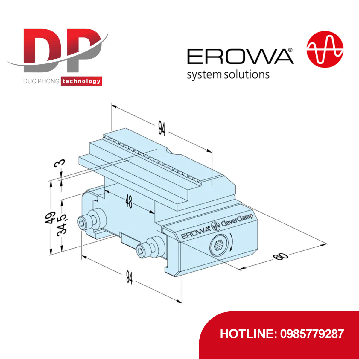 Lợi ích: Chiều cao 49mm và bản rộng 94mm giúp nâng phôi lên và tăng diện tích tiếp xúc, tối đa hóa khả năng tiếp cận trục chính trong gia công 5 trục và tăng độ cứng ổn định. Kẹp dập phôi thô chỉ 3mm giúp giải phóng phần lớn phôi cho việc gia công, đạt hiệu suất cao.